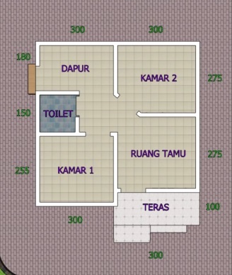 Umumnya memiliki luas bangunan 36 m² dengan lahan 60-90 m². Contoh pembagiannya: